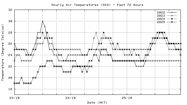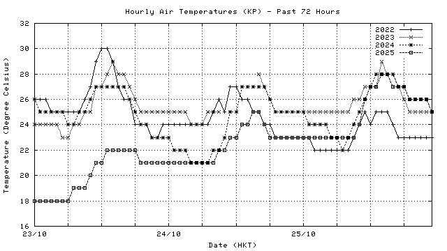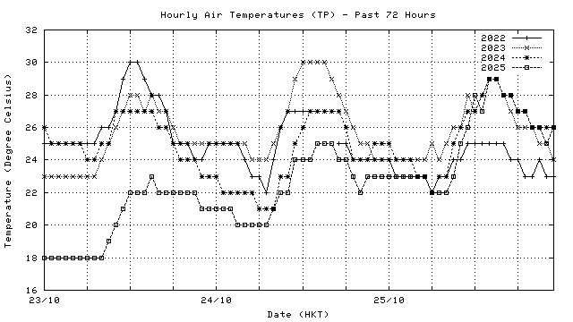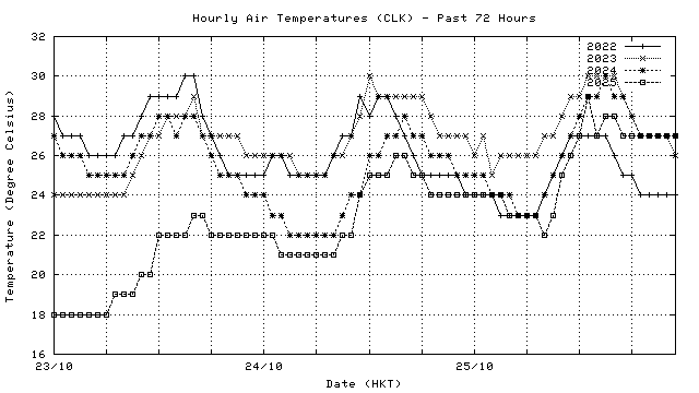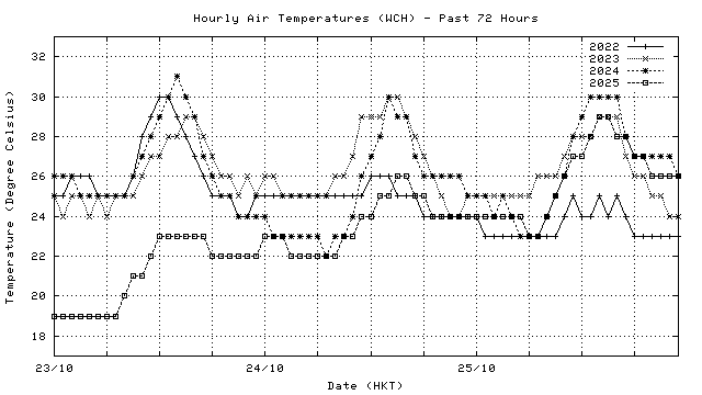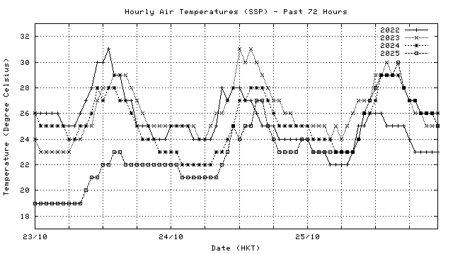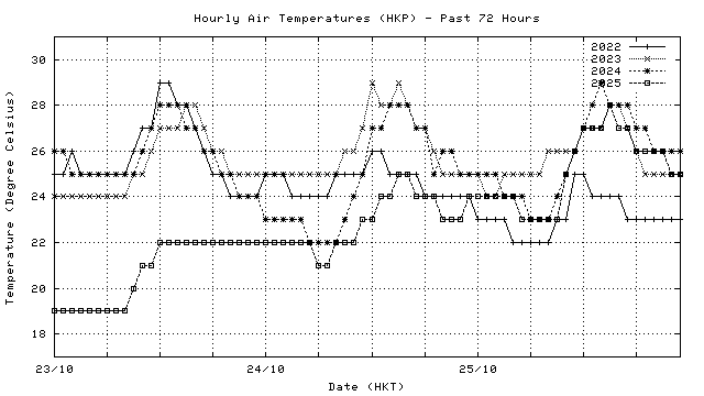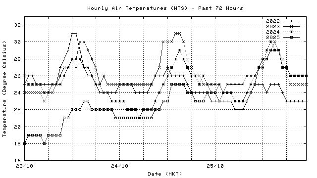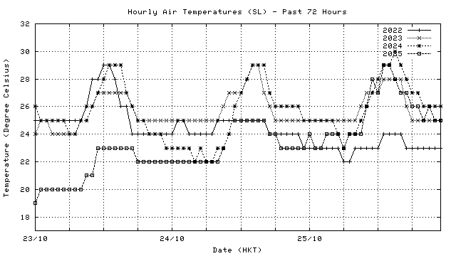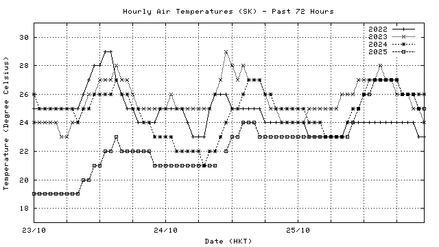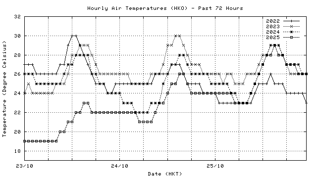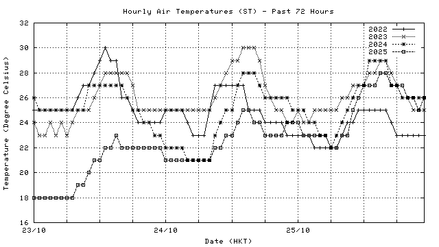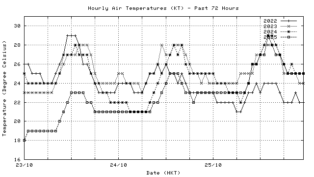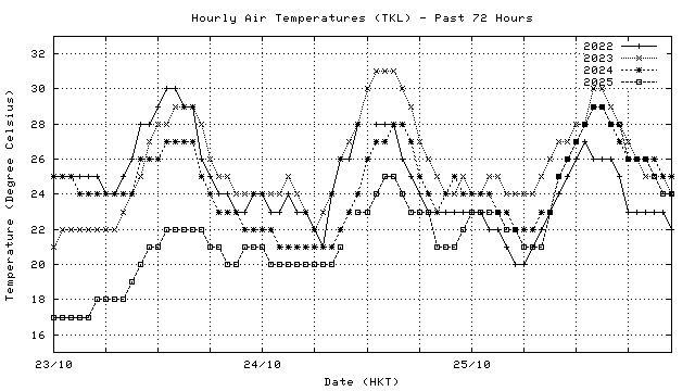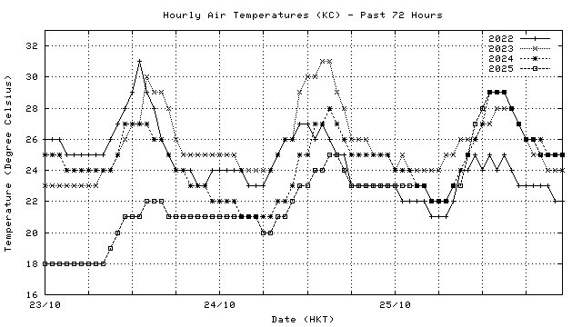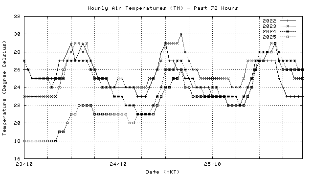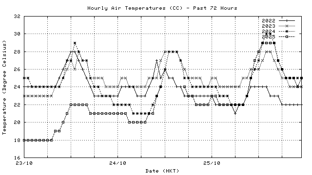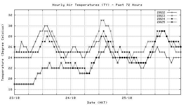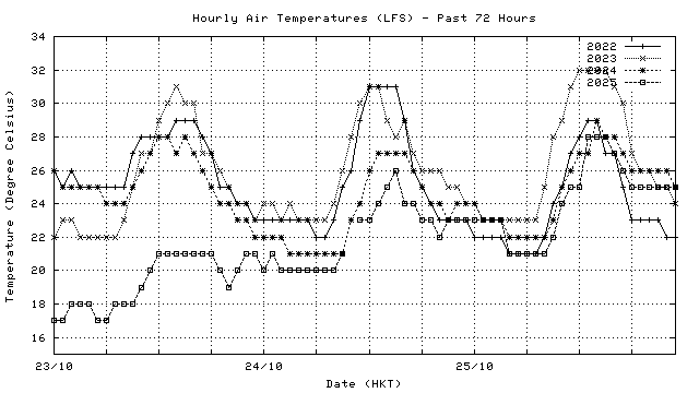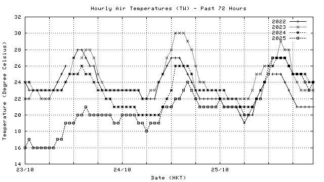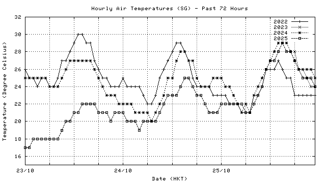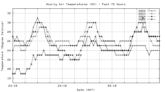 Hourly air temperatures for recent years 過去數年本天內每時平均氣溫比較