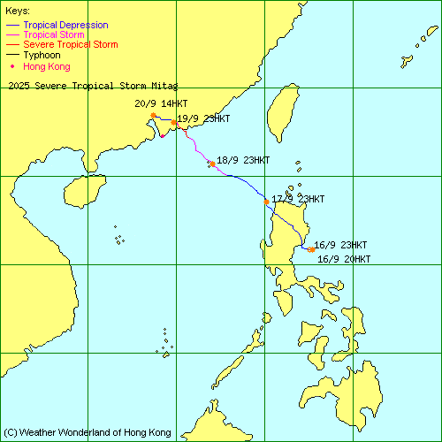 | 2025-23W | Mitag 米娜 | L.P. 低氣壓 | HKO 香港天文台 | 路徑資料 | 氣象觀測 | 警告 |