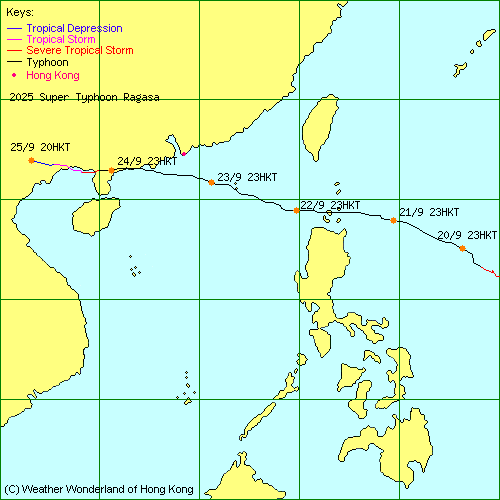 | 2025-24W | Ragasa 樺加沙 | L.P. 低氣壓 | HKO 香港天文台 | 路徑資料 | 氣象觀測 | 警告 |