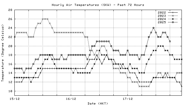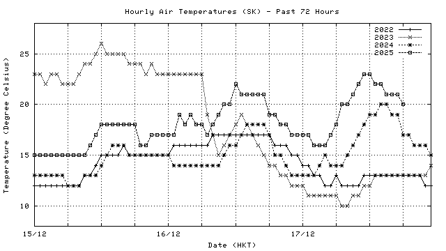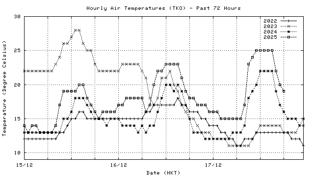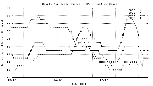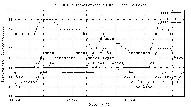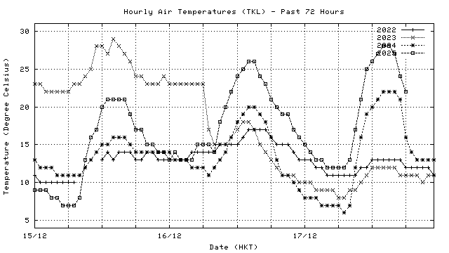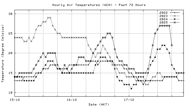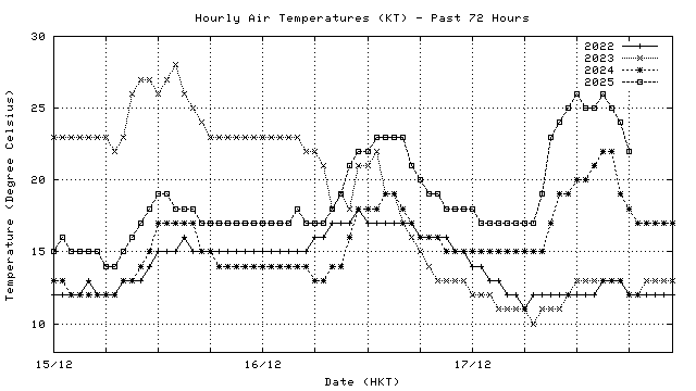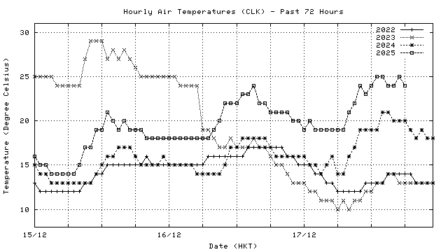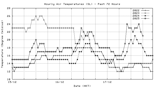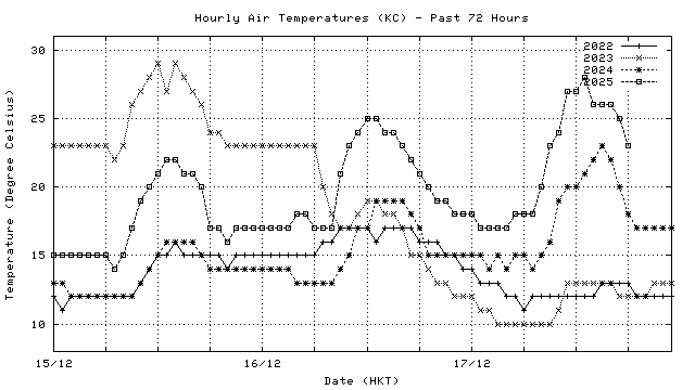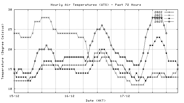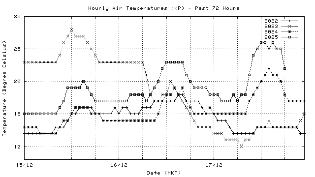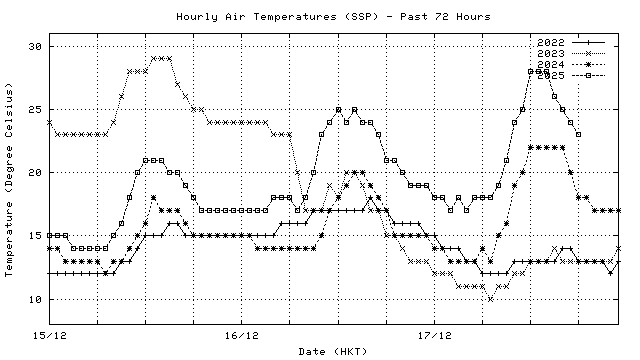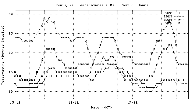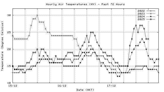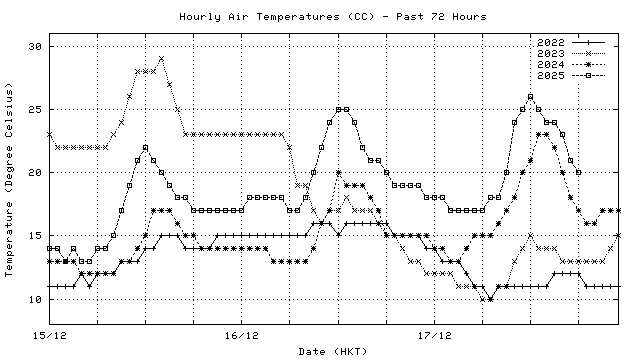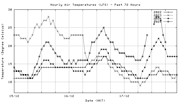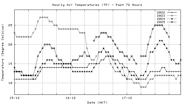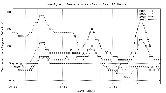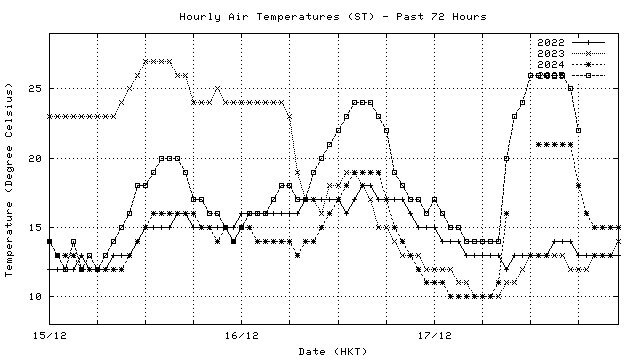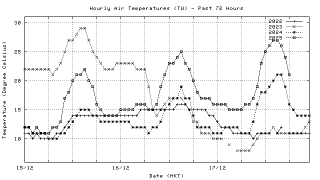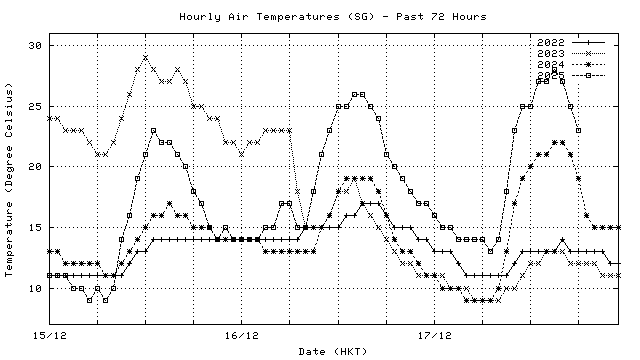 Hourly air temperatures for recent years 過去數年本天內每時平均氣溫比較